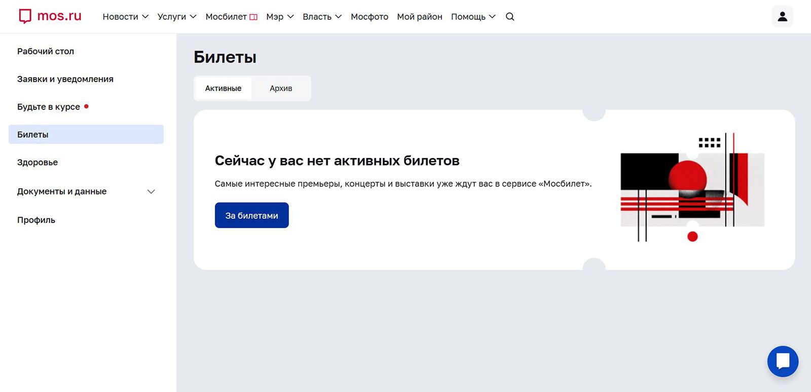В разделе «Заявки и уведомления» можно найти сообщения и актуальные статусы по полученным услугам, платежам и обращениям. Важные оповещения, анонсы сервисов и полезные материалы публикуются в разделе «Будьте в курсе». Все электронные билеты, оформленные через «Мосбилет», хранятся в специальном разделе.