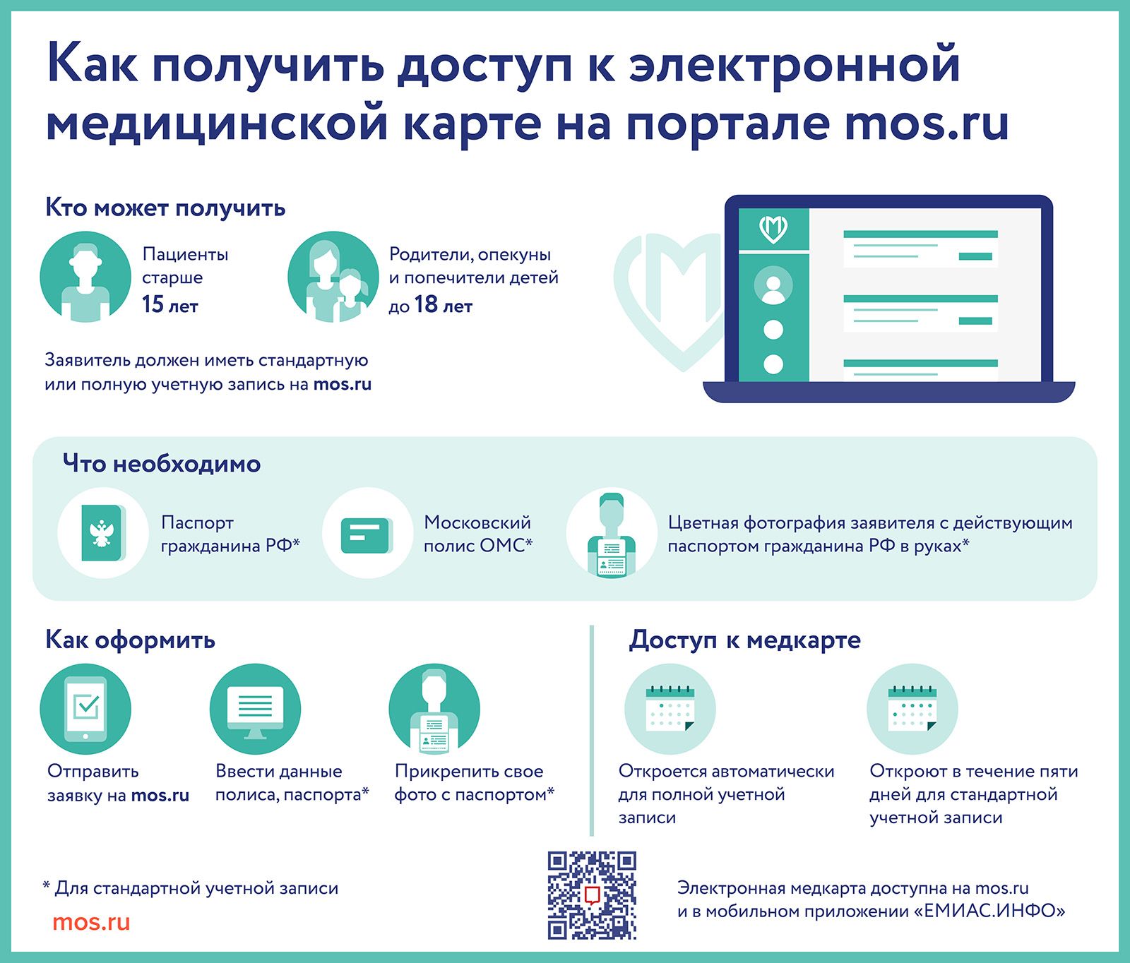 Пользоваться электронной медицинской картой могут жители Москвы, достигшие 15-летнего возраста и имеющие полис обязательного медицинского страхования. Для этого необходимо зарегистрироваться на портале mos.ru. Обладателям полной учетной записи электронная медицинская карта доступна автоматически. Чтобы получить доступ к сервису со стандартной учетной записью, потребуется до пяти рабочих дней после подачи заявки.