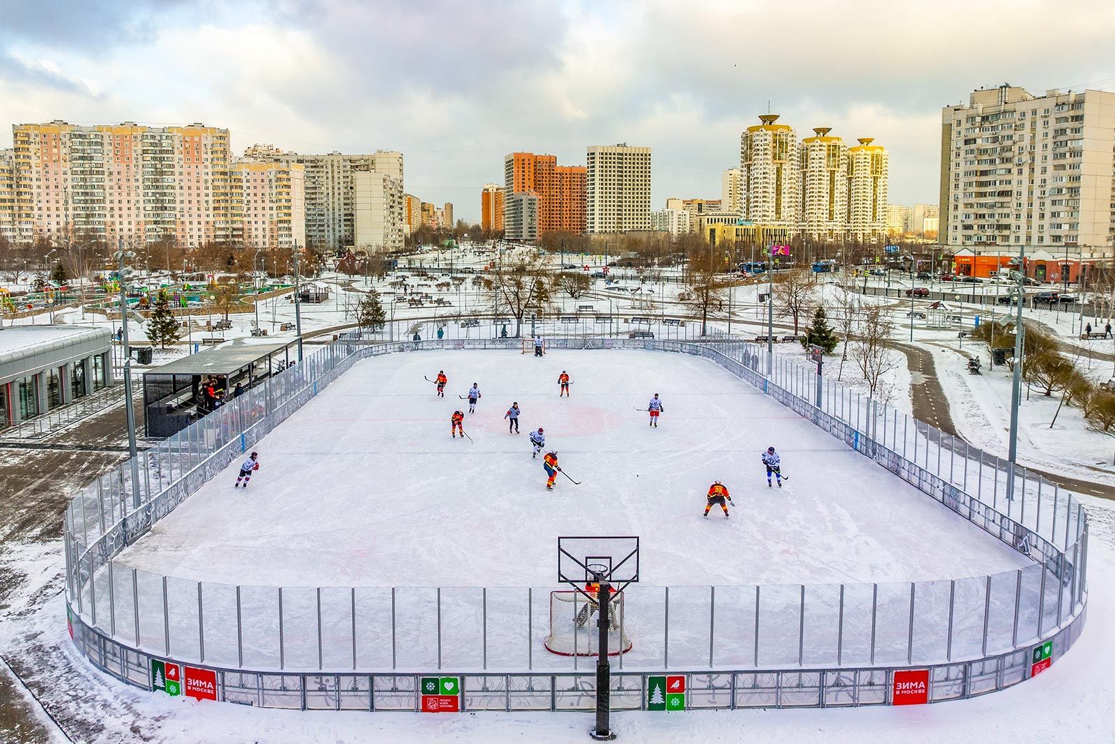 В прошлом году на месте устаревших спортивных зон или свободных пространств обустроили 11 многофункциональных площадок в рамках обновления городской инфраструктуры зимнего и летнего отдыха. Они состоят из хоккейной коробки и павильона, где можно перекусить, переодеться и отдохнуть. Благодаря современным технологиям площадки быстро переводятся из зимнего режима в летний и наоборот. Сейчас горожане играют на них в хоккей, керлинг, мини-хоккей и катаются на коньках. В теплый сезон там можно заняться волейболом, баскетболом, бадминтоном, мини-футболом и даже хоккеем на роликах.