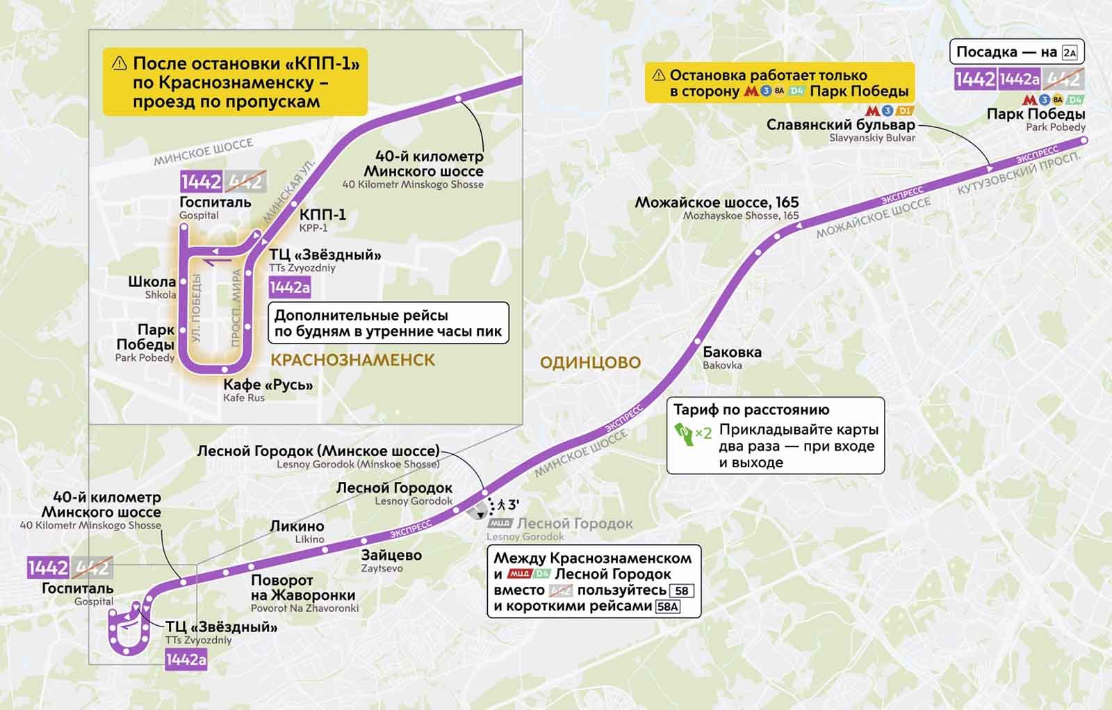 Для оплаты проезда на новых маршрутах нужно прикладывать карту как на входе, так и на выходе. Проезд по карте «Тройка» будет стоить от 71 рубля до 190 рублей на маршруте № 1442 и от 71 рубля до 199 рублей на маршруте № 1442а.