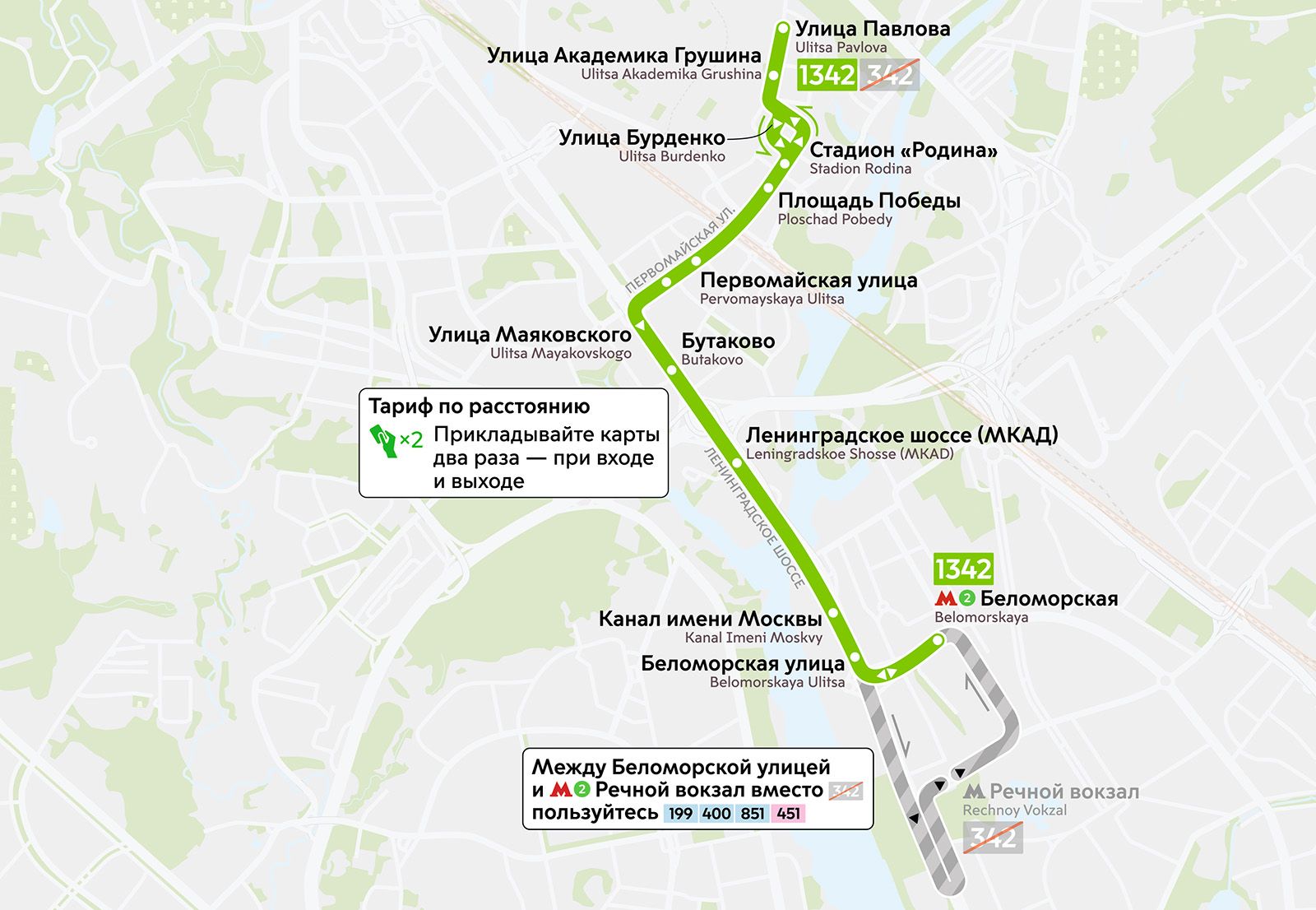 У маршрутов № 1342 и 1472 стоимость поездки будет зависеть от расстояния. Прикладывать карту к валидатору нужно дважды — при входе и выходе. Так, тариф на автобусах № 1342 — от 63 до 72 рублей при оплате «Тройкой» и от 64 до 73 рублей — банковской картой. В автобусах № 1472 поездка будет стоить от 63 до 120 рублей (оплата «Тройкой») либо от 64 до 121 рубля (оплата банковской картой).