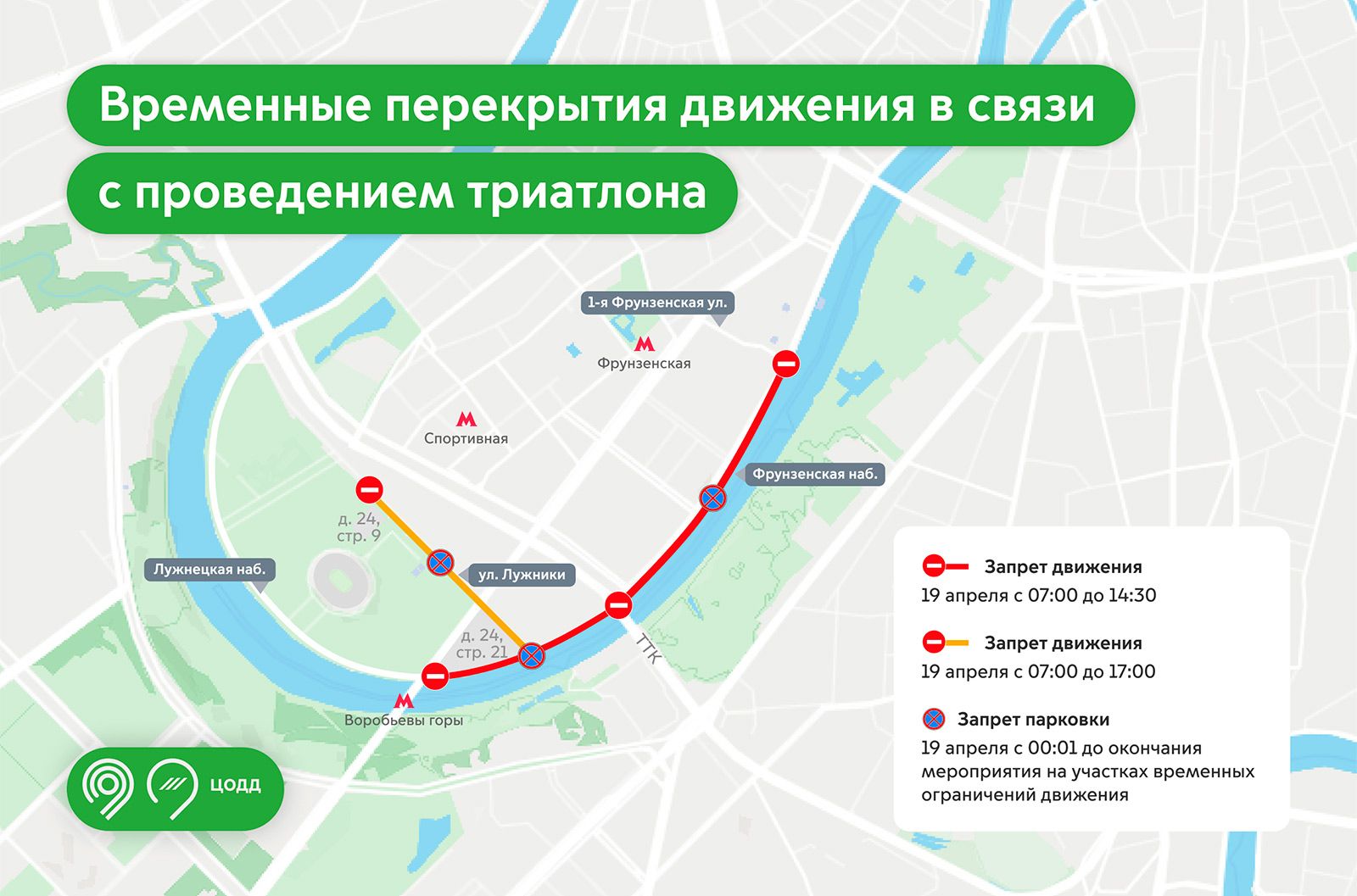 19 апреля схема движения транспорта в Хамовниках временно изменится в связи с проведением соревнований по триатлону.