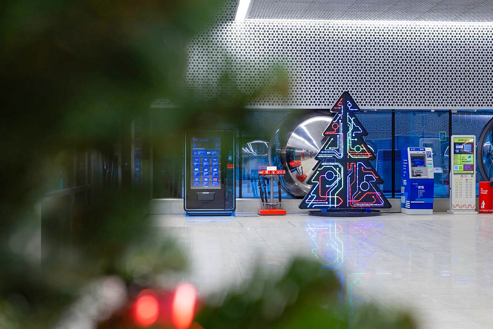 Цифровые елки, украшенные не привычными праздничными шарами, а линиями метро и пересадочными узлами, разместили в вестибюлях станций «Курская» (аванзал) и «Марьина Роща» (выход № 6) Большой кольцевой линии.