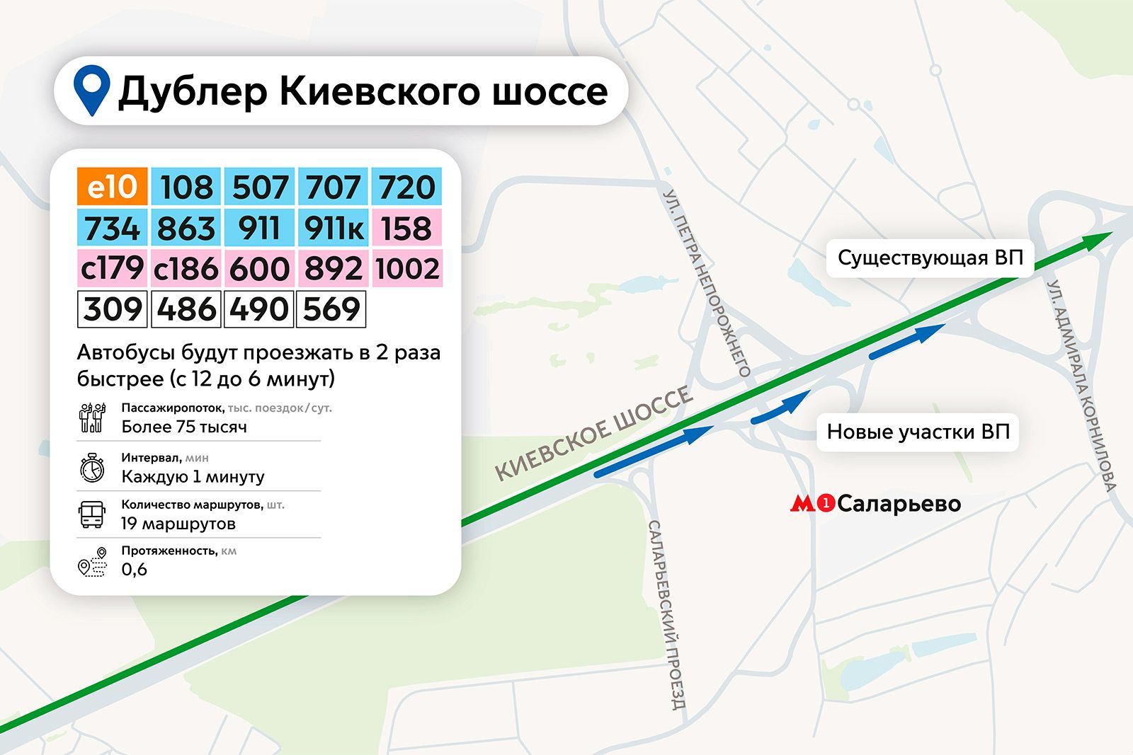— на дублере Киевского шоссе в районе пересечения с улицей Петра Непорожнего выделили полосу длиной 0,6 километра, время проезда автобусов сократится с 12 до шести минут;