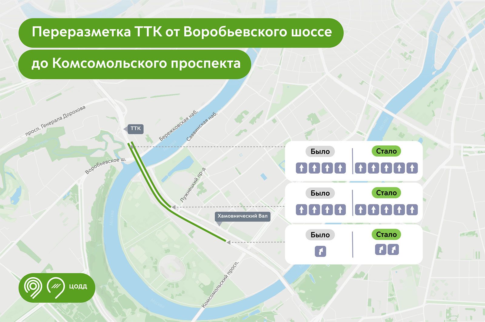 Теперь движение по пяти полосам вместо четырех организовано на двухкилометровом участке внешней стороны ТТК (от выезда с Воробьевского шоссе до съезда на Комсомольский проспект) и на участке длиной один километр по внутренней стороне (от выезда с улицы Хамовнический Вал до съезда на Бережковскую набережную и проспект Генерала Дорохова). На съезде с магистрали на Комсомольский проспект водителям доступны две полосы для движения вместо одной.