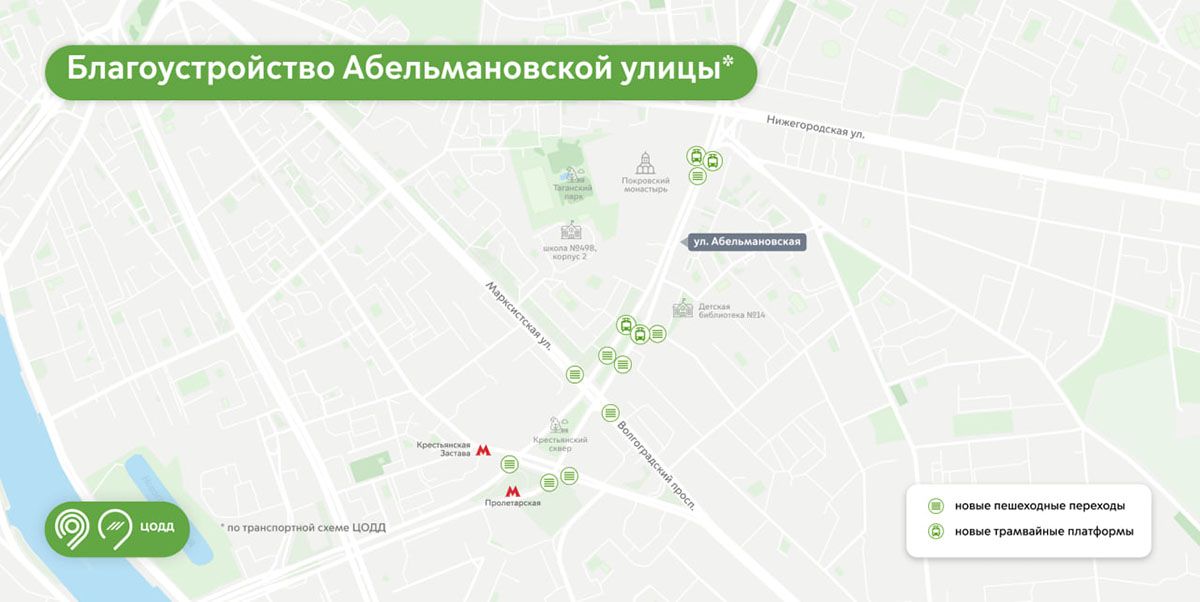 18 новых пешеходных переходов позволили быстрее добираться до социальных объектов, магазинов и достопримечательностей. Например, на Абельмановской улице появились короткие пути к станциям метро «Пролетарская» и «Крестьянская Застава», Крестьянскому скверу и Таганскому парку, Покровскому монастырю и Воскресенскому собору, второму корпусу школы № 498 и Центральной детской библиотеке № 14. Благодаря переходам в 3-м Крутицком переулке пешеходы смогут быстрее пройти к станции метро «Пролетарская», Новоспасскому монастырю и пруду, храму Сорока Севастийских Мучеников и дому купца Виноградова.