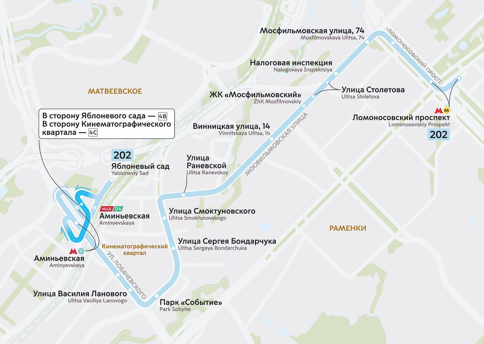 С 22 ноября в районе Раменки на западе столицы заработает новый маршрут наземного транспорта — № 202. Он свяжет жилые комплексы в кинематографическом квартале со станциями метро «Аминьевская» Большой кольцевой линии и «Ломоносовский проспект» Солнцевской линии.