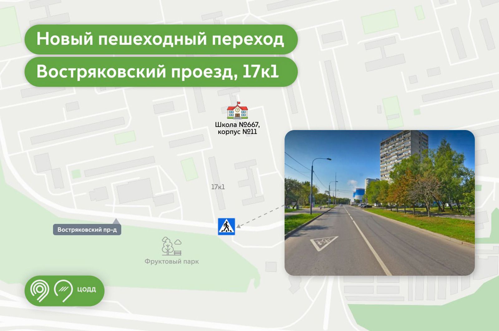 В Востряковском проезде (в районе дома 17, корпуса 1) пешеходный переход появится на пути в школы и детские сады № 667 имени Героя Советского Союза К.Я. Самсонова, а также в расположенный рядом Фруктовый парк. На Кустанайской улице (в районе дома 9, корпуса 1) будет еще один переход, благодаря чем станет удобнее добираться до управы района Зябликово, детской библиотеки, школ и детских садов.