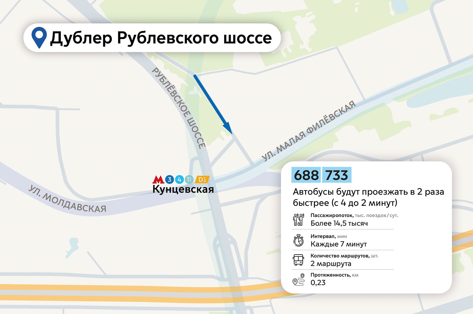 Выделенную полосу длиной 230 метров сделают на дублере Рублевского шоссе в районе пересечения с Малой Филевской улицей. Автобусы будут проезжать этот участок в два раза быстрее (за две минуты вместо четырех).