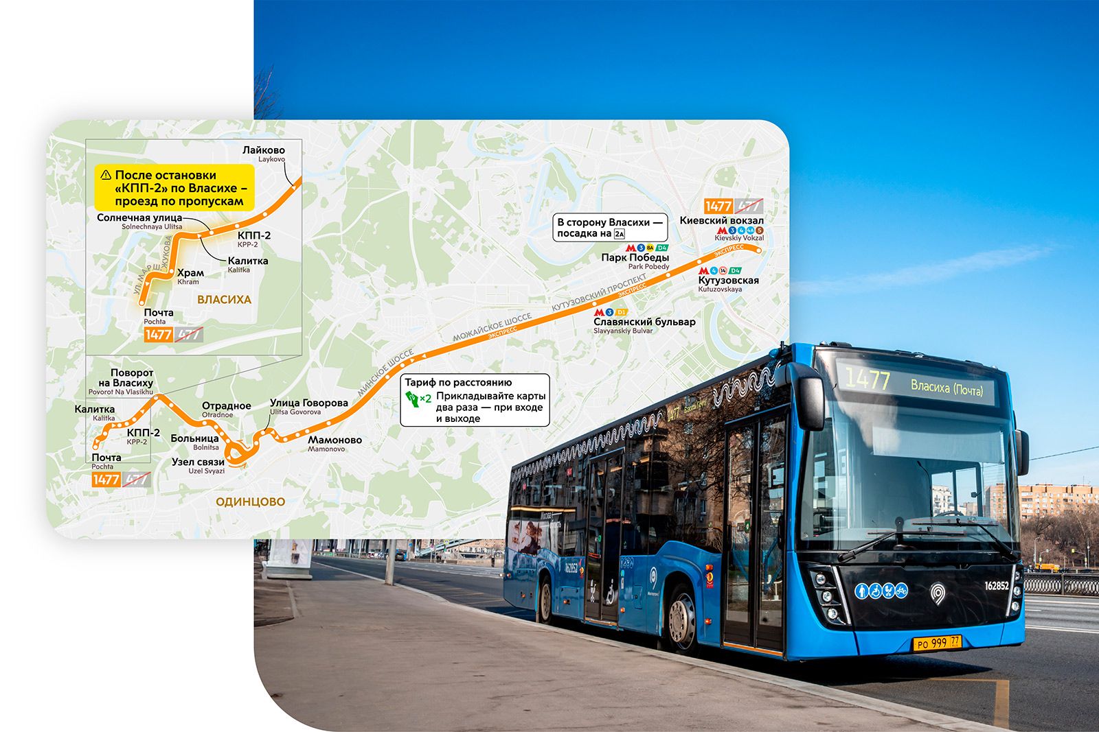 На маршруте № 1477 стоимость разовой поездки по карте «Тройка» будет ниже, чем у областного перевозчика. А использование абонементов «Единый» зоны «Пригород» на 30, 90 или 365 дней позволит экономить более 60 процентов в год на поездках в столицу и обратно. Еще с помощью этих абонементов можно совершать бесплатные пересадки на весь городской транспорт: метро, Московские центральные диаметры (МЦД), Московское центральное кольцо, городские маршруты автобусов и электробусов, другие пригородные маршруты проекта «Москва — область» и круглогодичные речные электросуда, а также совершать поездки по столице на велосипедах и скутерах сервиса «Велобайк».