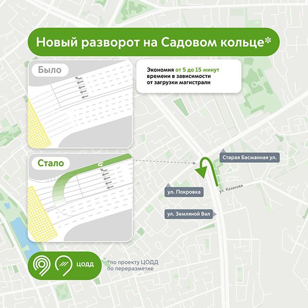 Благодаря таким проектам ЦОДД в этом году на Садовом кольце открыли пять новых разворотов: два — перед Дубининской и Татарской улицами, еще два — перед проспектом Академика Сахарова на внешнюю и внутреннюю сторону Садового кольца и один — перед зданием Международного информационного агентства «Россия сегодня». Эти изменения позволили сократить перепробег на нескольких участках кольца на один-два километра, а время в пути — до 10 минут.
