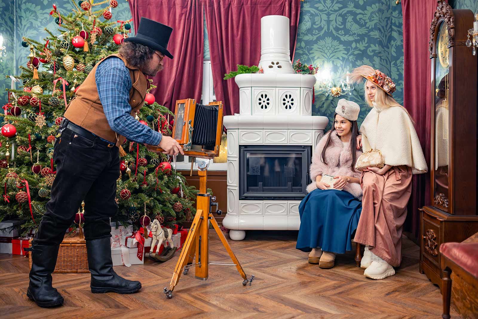 На Манежной площади воссоздана атмосфера старинной московской усадьбы. Посетители могут примерить исторические костюмы и сделать памятные фото в ретрофотоателье, отправить близким фирменную открытку и получить карту зимнего маршрута «Москва усадебная». Иностранные туристы отмечают, что фотосессия стала для них приятным эмоциональным опытом и необычным подарком на память о зимней прогулке по Москве.