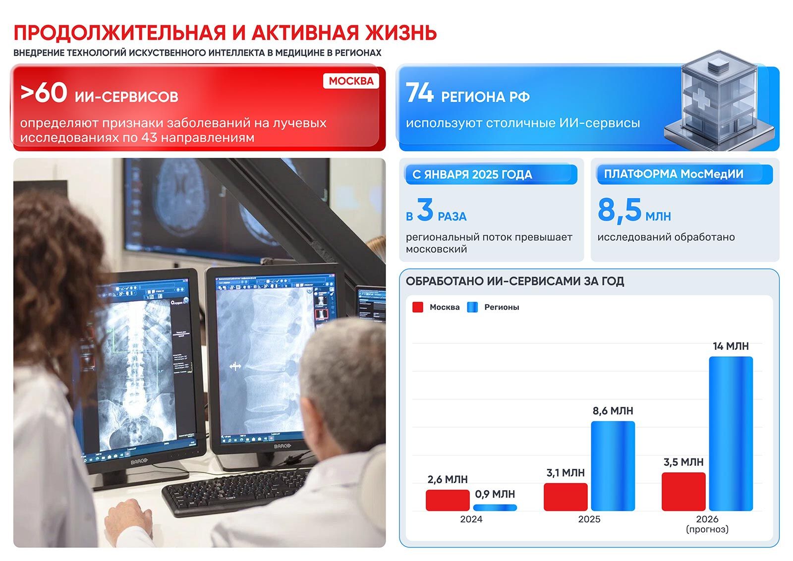 В 2024 году по поручению Владимира Путина была создана уникальная федеральная цифровая платформа «МосМедИИ», которая открыла медицинским организациям страны доступ более чем к 60 столичным ИИ-сервисам лучевой диагностики. Алгоритмы искусственного интеллекта анализируют снимки КТ, МРТ и других лучевых исследований, отмечают на них цветовыми подсказками области возможных отклонений от нормы, составляют описание исследования и делают необходимые измерения. При этом финальное решение остается за врачом.