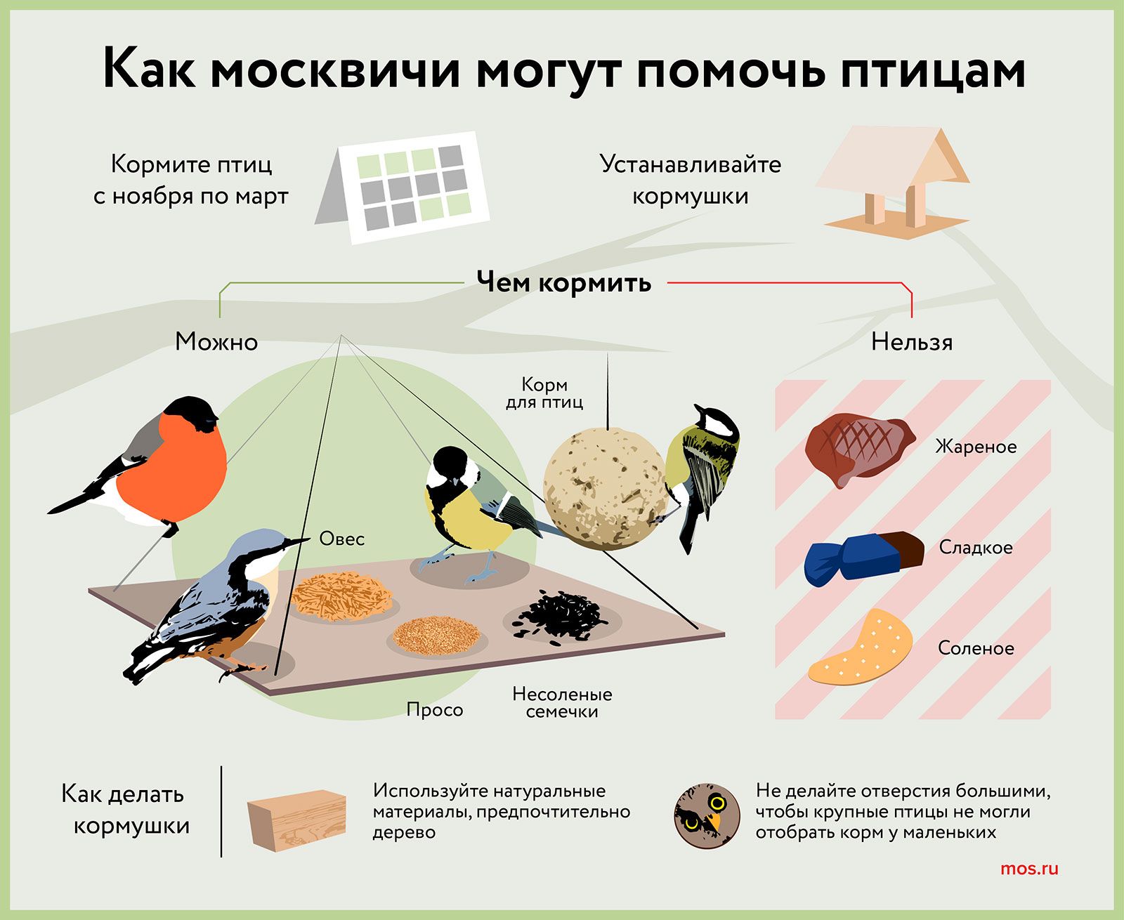 Биологи рекомендуют подкармливать птиц при наступлении неблагоприятных погодных условий, таких как резко отрицательные температуры, обильные снегопады, метели, ледяной дождь. Помимо свежего несоленого сала, можно использовать семена диких трав, подсолнечника, зерна пшеницы и ячменя, кедровые орехи, фундук, желуди, засушенные ягоды рябины, боярышника и шиповника. При этом важно подкармливать птиц регулярно: если они несколько раз не найдут еды в привычном месте, то могут перестать прилетать. Однако не стоит полностью заменять их природный рацион: помощь человека должна быть дополнением, а не единственным источником пищи.